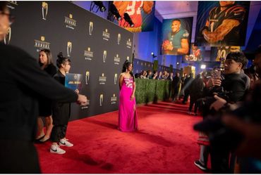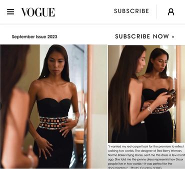 Quannah Chasinghorse wearing Red Berry Woman for the 2024 Oscars. Chasinghorse was chosen by Anna Wintour as a favorite look for the 2024 Oscars.