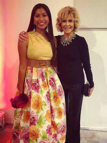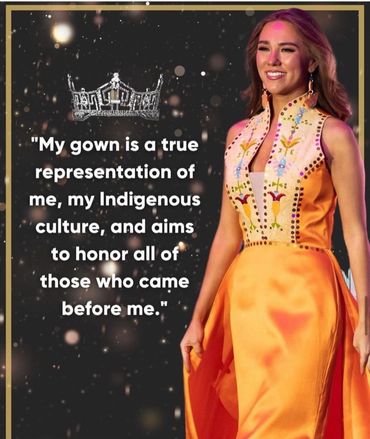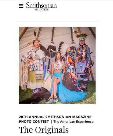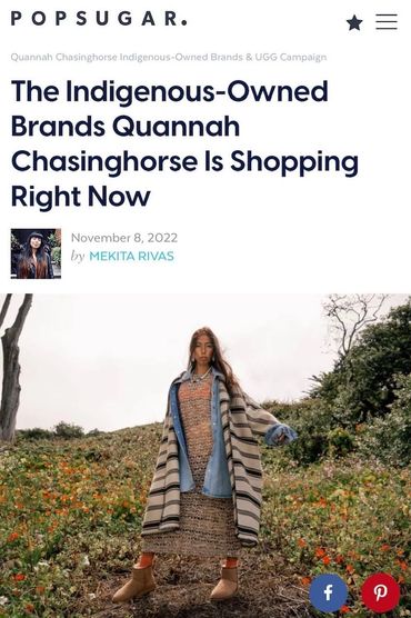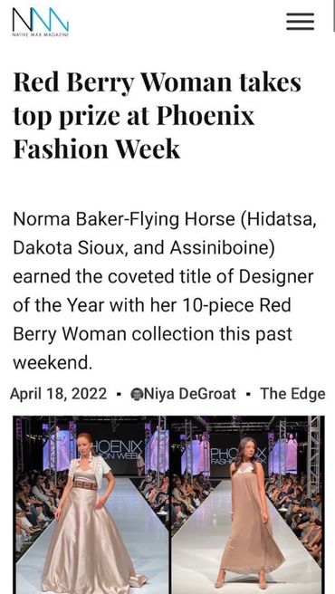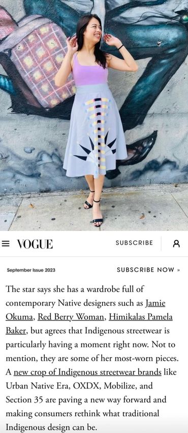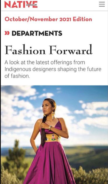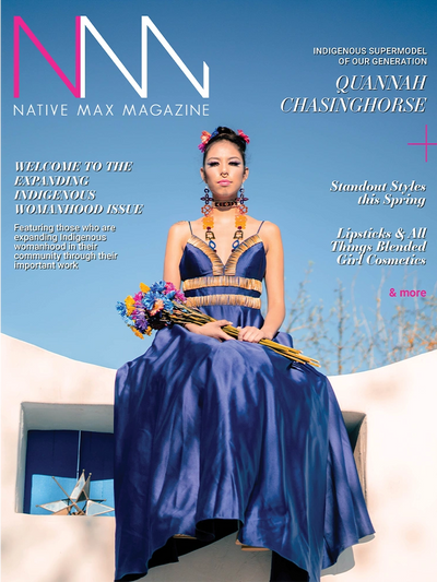 Quannah Chasinghorse wearing a Red Berry Woman upcycled gown for the Native Max Magazine "Expanding Indigenous Womanhood" issue.